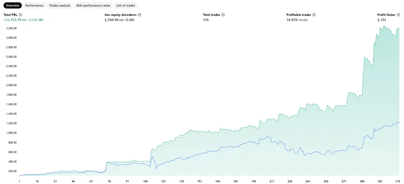 The average annual return stood at about 67%, far beyond what most strategies can consistently achieve. The strategy executed a total of 321 trades over 12 years, an average of about 27 trades per year (2-3 trades per month). This highlights its efficiency -exceptional returns with minimal trading activity.